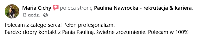 Jestem doświadczoną rekruterką, która specjalizuje się w pomaganiu osobom bez pewności siebie znaleźć wymarzoną pracę. Wspieram moich klientów w tworzeniu idealnego CV, które wyróżnia się na tle innych aplikacji. Moje zaangażowanie i indywidualne podejście gwarantują wysoką jakość usług, dzięki czemu każda osoba czuje się pewnie w procesie rekrutacyjnym. Z pasją dążę do tego, aby każdy mój klient osiągnął sukces zawodowy.