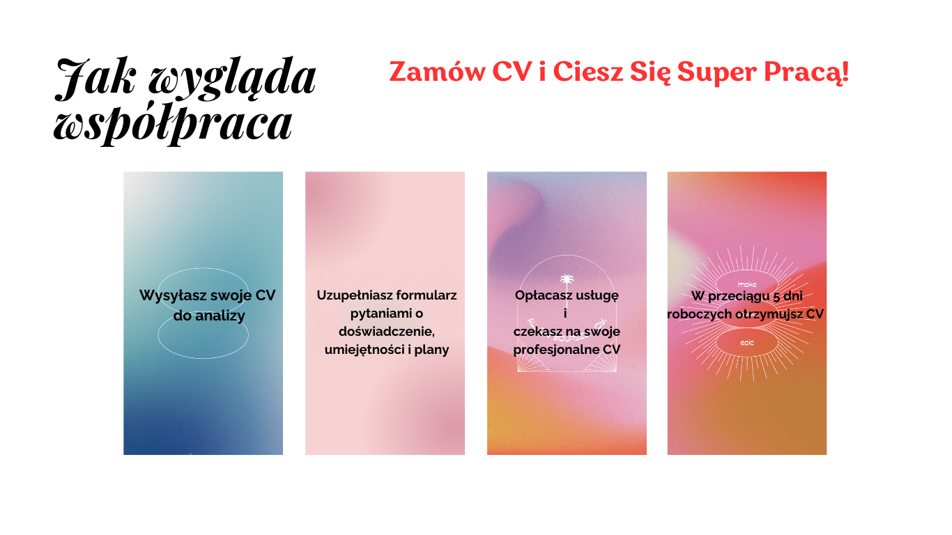 Dostarczasz mi niezbędne informacje o swoich oczekiwaniach, umiejętnościach i doświadczeniu. W przeciągu 5 dni roboczych otrzymujesz swoje idealne CV.